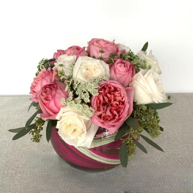 8″ wide, 12″ high glass bubble bowl. 8 Pink Ohara Garden roses, 8 White Ohara Garden roses for a total of 16 roses!